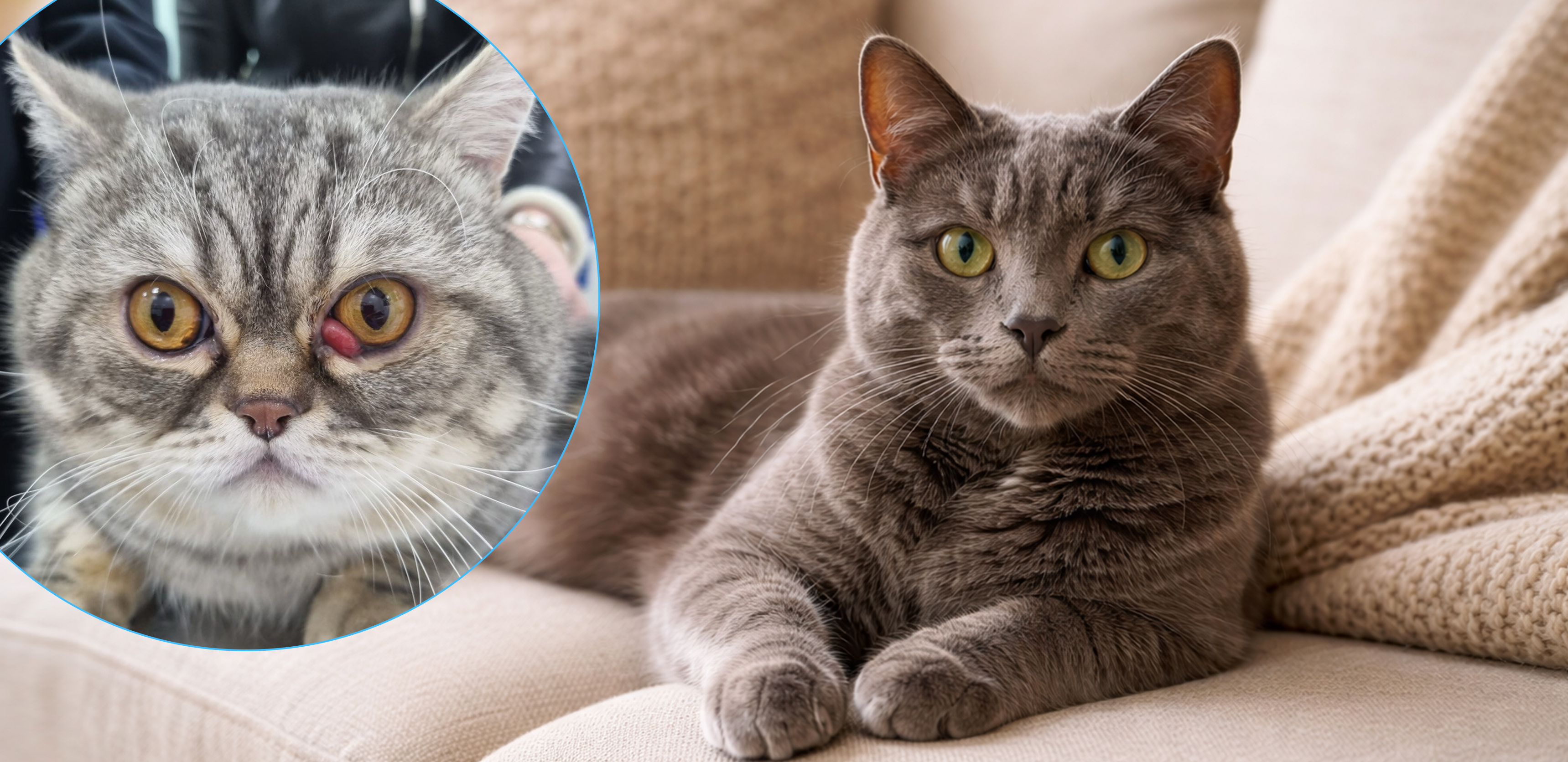 Кошки также попадают на прием с выпадением слезной железы, но вот у них строение черепа как раз является «слабым местом» – брахицефалическое строение черепа кошек и слабые связки не удерживают железу в анатомическом положении. Персидские, британские, шотландские кошки и экзоты подвержены этой проблеме больше остальных кошачьих пород.